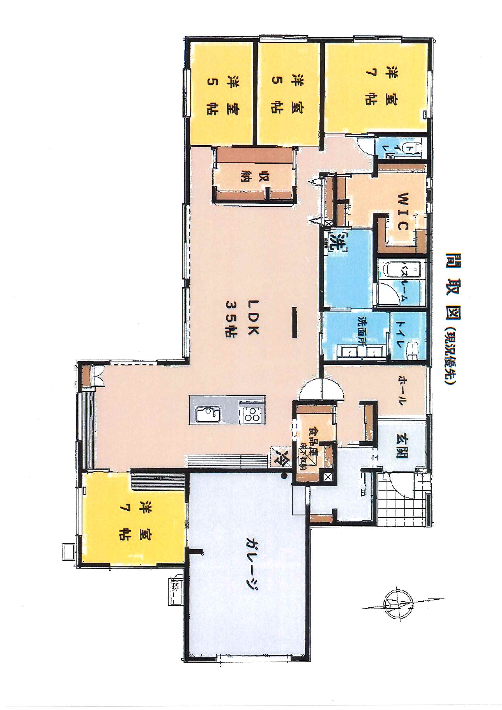 | 間取り | 4SLDK LDK(約35帖)、洋室×4(7帖×2、5帖×2)、WIC、収納、シャッター付きガレージ(電気自動車充電設備有り) |