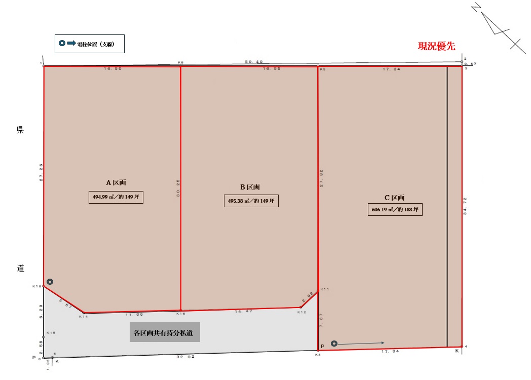 | 土地面積 | 494㎡/149~坪 | 接道 | 私道(アスファルト舗装)+公道(県道)A区画のみ |
